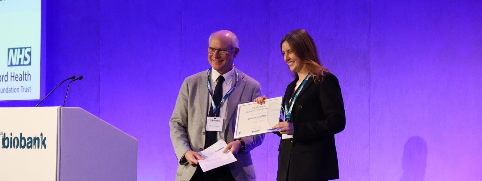 Ludovica’s win was announced at UK Biobank’s Scientific Conference on 8 December 2025 where she was presented with the inaugural award on stage by Professor Sir Michael Ferguson, a member of UK Biobank’s Board of Trustees.